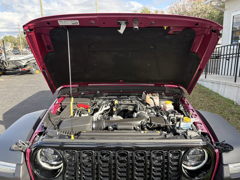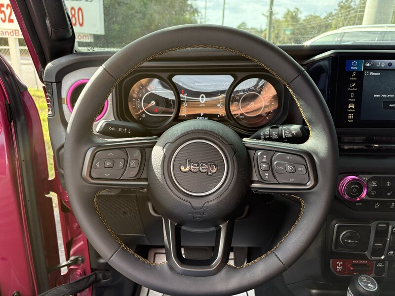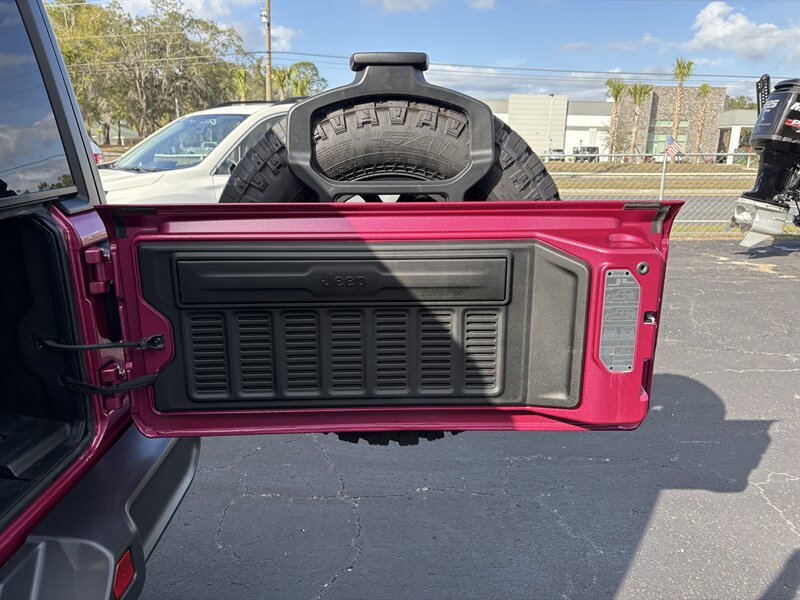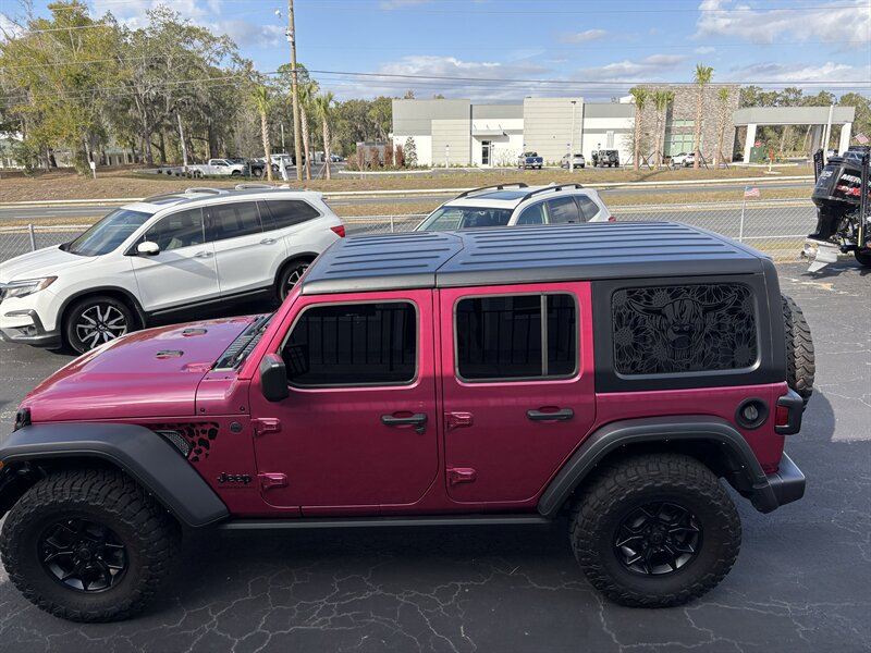 - Exterior: Limited Edition Tuscadero Pearl Coat paint for a striking, premium finish; Black 3-Piece Hard Top for quieter highway driving and better insulation than soft tops; deep tint sunscreen windows for privacy and sun protection; Willys styling cues that emphasize function and rugged looks.
